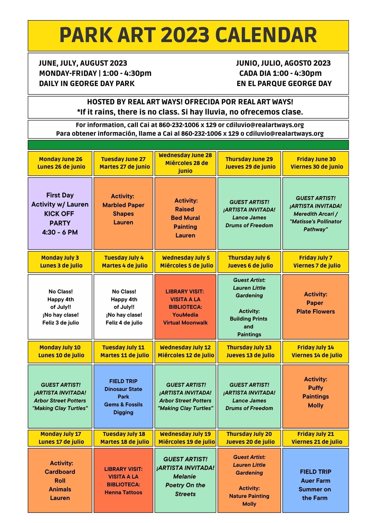 Esta programa de 9 semanas proporciona artes, literatura y actividades de jardín para la comunidad. Con artes visuales (pinturas, dibujos, cerámica), artes basados en el ambiente, baile, artes de literatura, y musica cada día de Park Art ofrece nuevas oportunidades para aprender y crear y disfrutar!