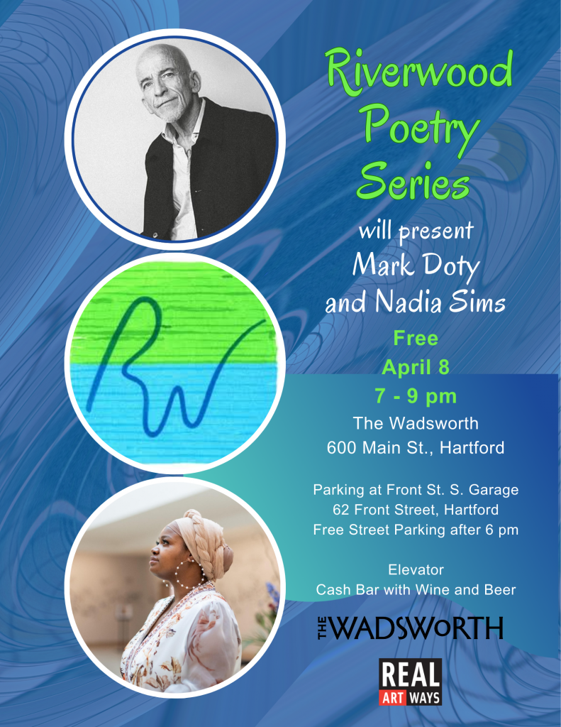 Riverwood Poetry Series will host Mark Doty and Nadia Sims on Wednesday, April 8, 2026, at 7 PM, in The Avery Theater at The Wadsworth, 29 Atheneum Square North in Hartford.